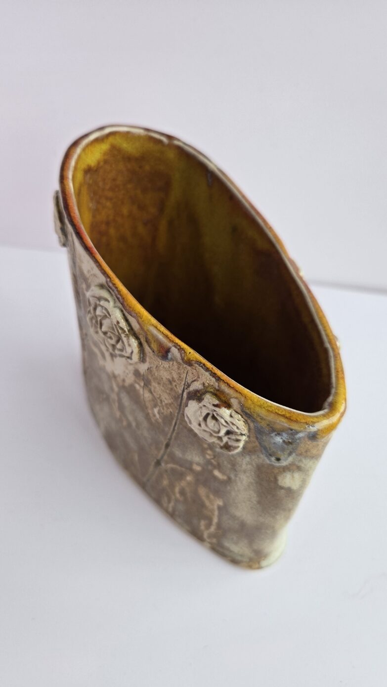 Lummav värvimäng: Toote välispinda katab rahulik pruunikaskirju glasuur, taimemustrid on inspireeritud loodusest ja maapõuest. Hoidja sisemus üllatab aga särava oranži glasuuriga, luues efektse ja sooja kontrasti, mis lisab igale köögile särtsu.
