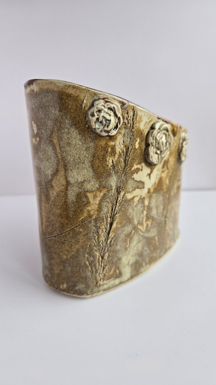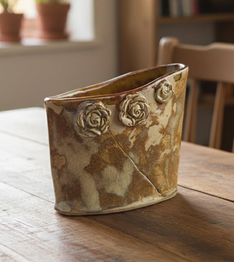 Nutikas disain ja mugavus: Hoidja ülemist serva kaunistavad reljeefsed keraamilised roosiõied. Lisaks silmailule on neil ka praktiline funktsioon – lilled pakuvad sõrmedele tuge ja tagavad kindla haarde, et hoidja ei libiseks käest ka siis, kui toimetad köögis märgade kätega.