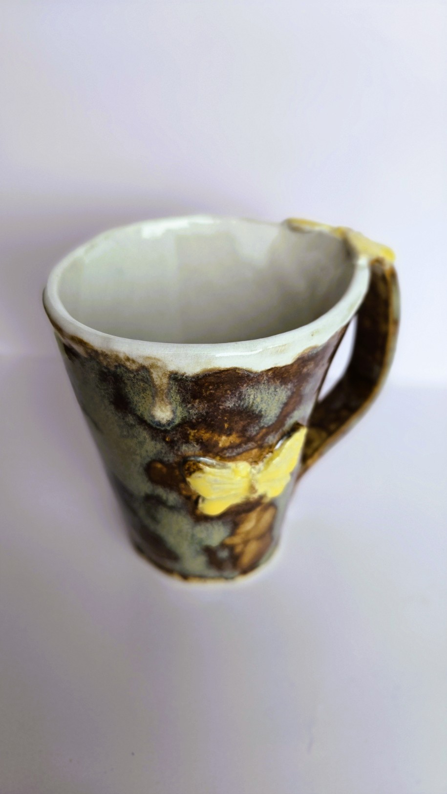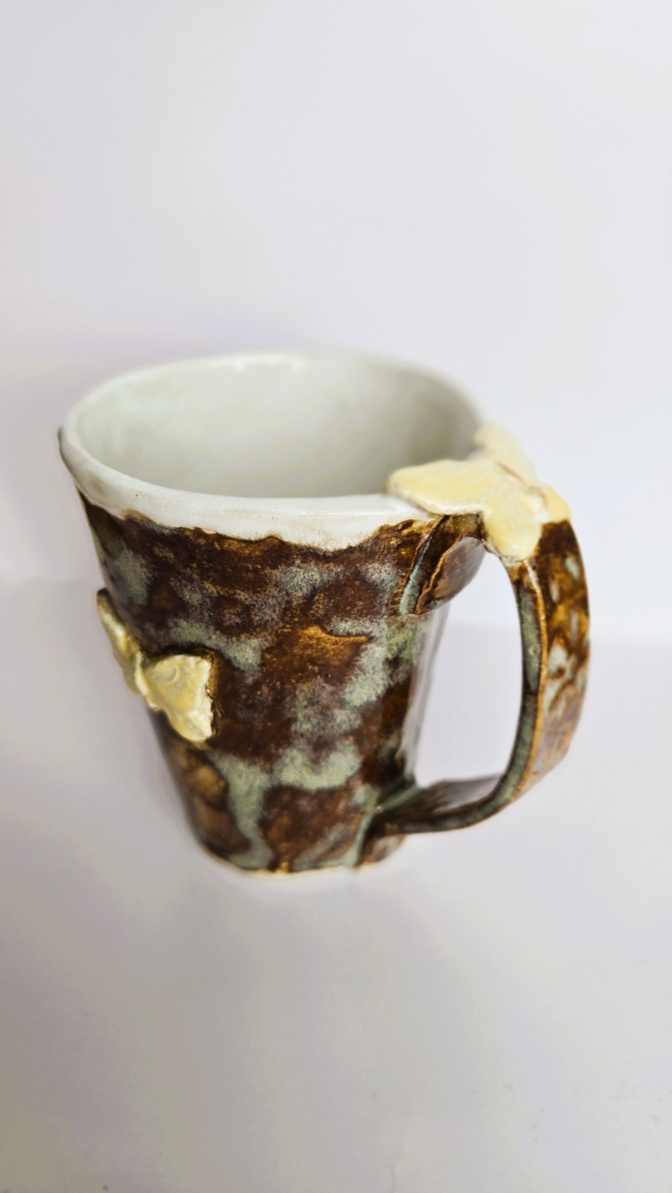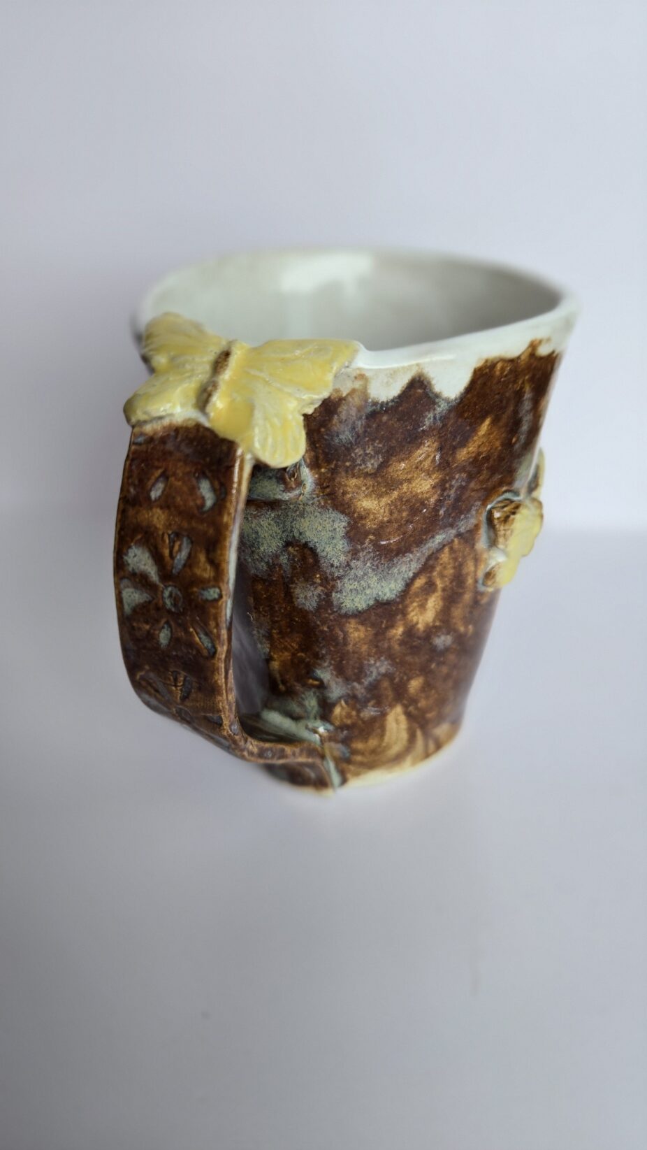 Tass on kaetud rahuliku pruunikaskirju glasuuriga. Glasuuri varjundid mänglevad tumedamatest kohvitoonidest heledamate liivakarva laikudeni, muutes tassi täiesti ainulaadseks kunstiteoseks.