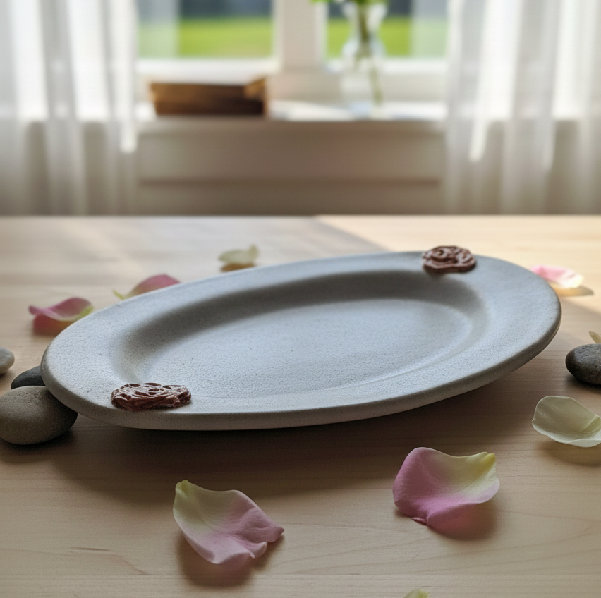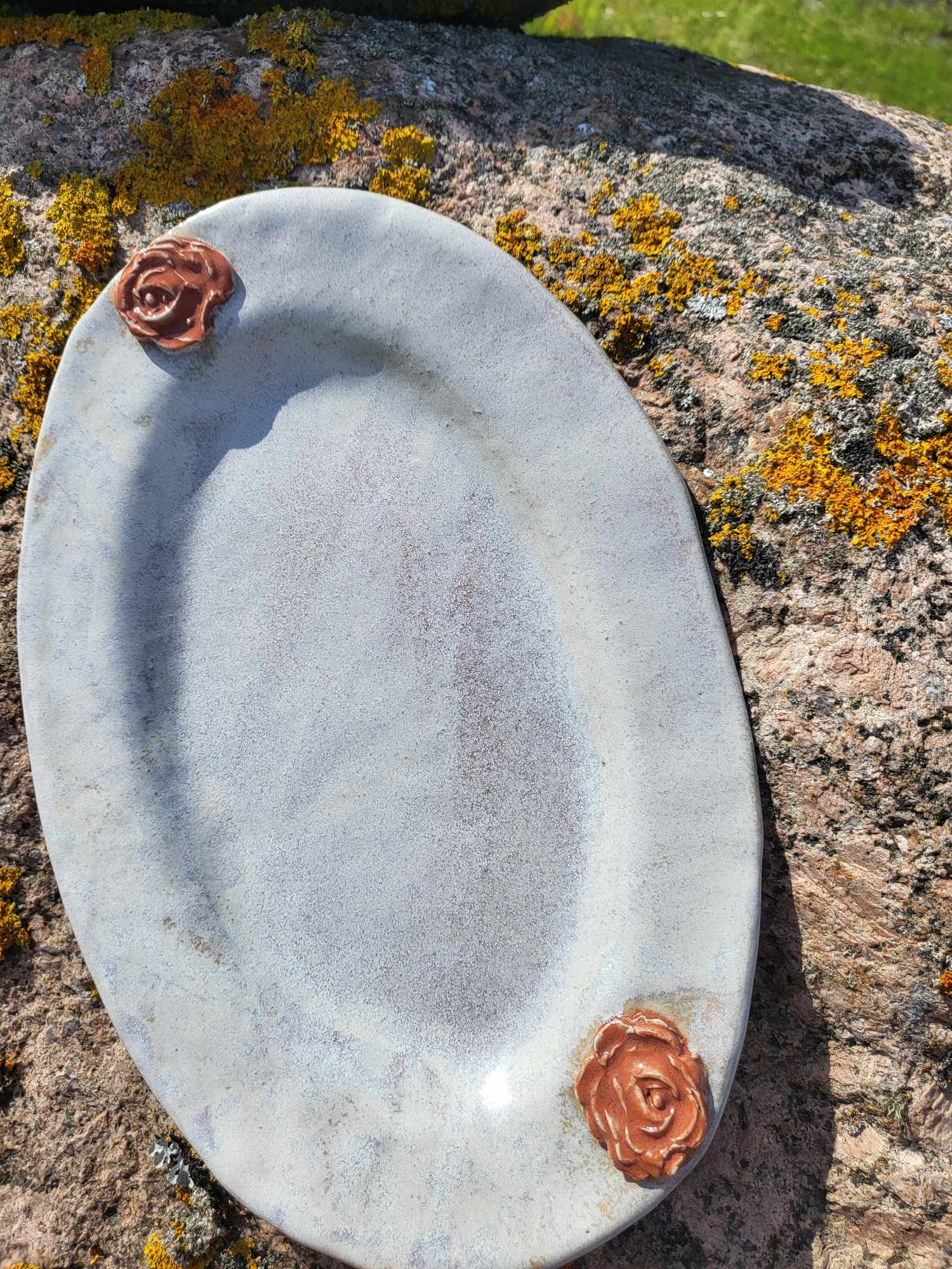 Valge ovaalne vaagen, kaunistusena punased roosid , 28,5 cm pikk.